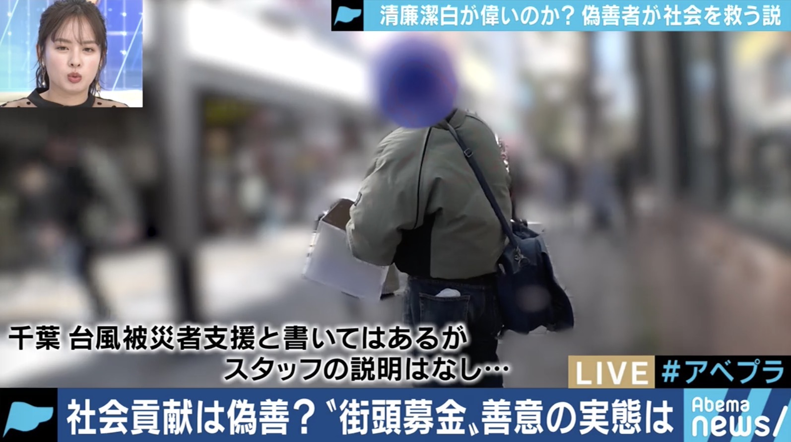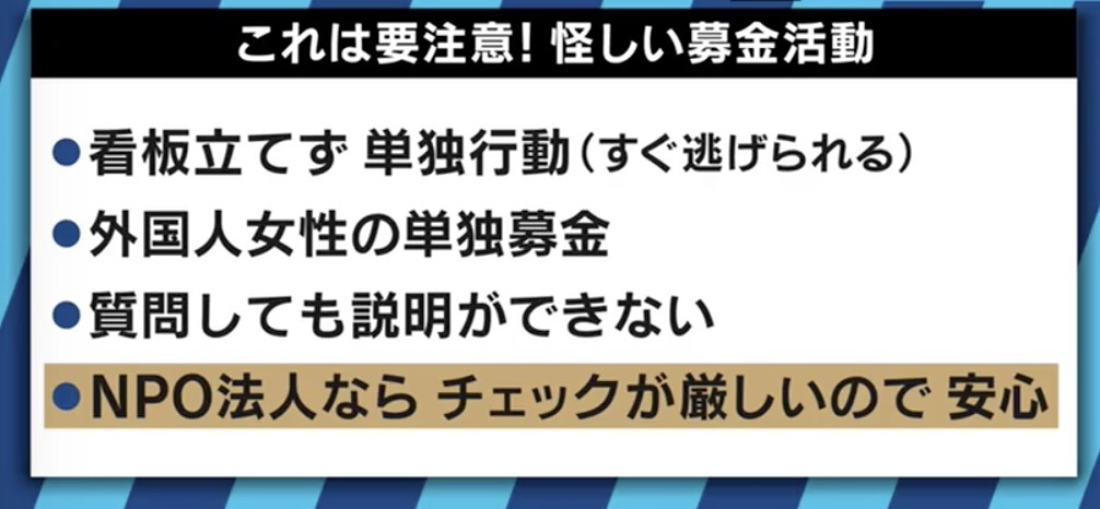 実際、番組が取材を進める中で出会った「千葉の台風被災者への支援」と銘打って募金を集めていた男性は、詳細について説明を求めても「ちょっと分からない。ちょっと…」と口ごもり、「私は集金しないので分からない」と、いくら集まったのかも団体からは教えてもらえないと話し、どこかへ立ち去った。