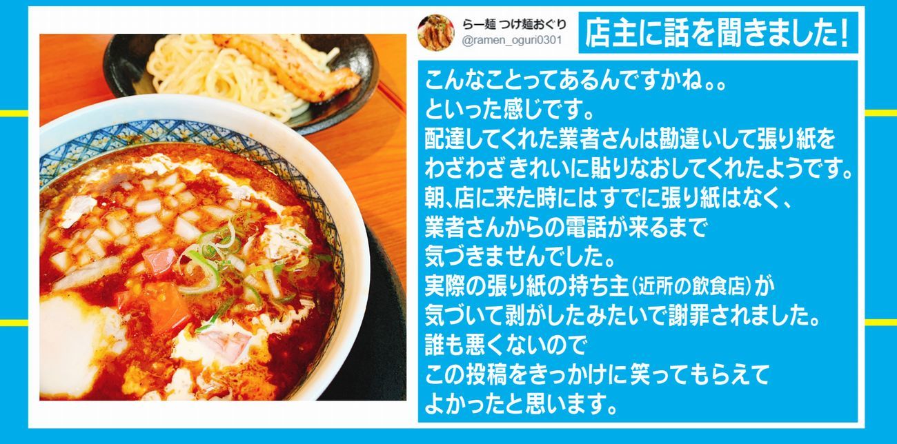 業者も確認しろ、と言いたいが深夜に電話されても出ない可能性のが高いしな。後、まずは最初の張り紙の時点で「○○(店の名前) 店主」と書いてあれば・・w