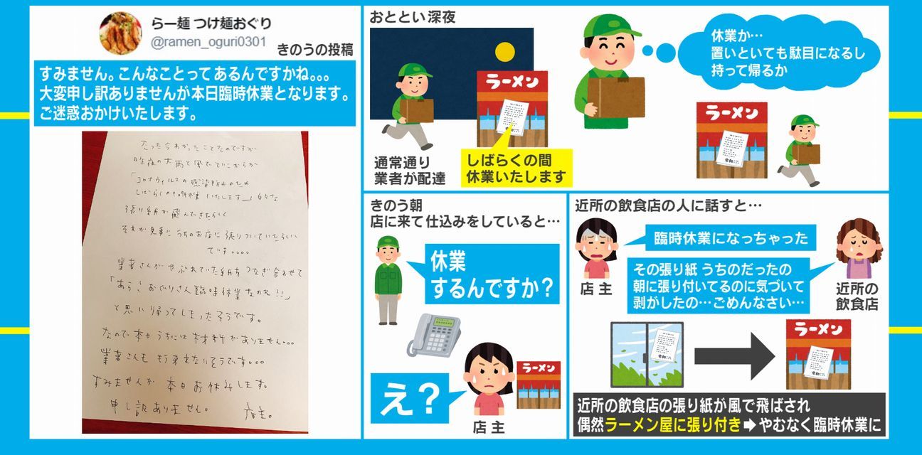 あるラーメン店の“臨時休業の理由”がネット上で話題に「これがほんとの風『表』被害」